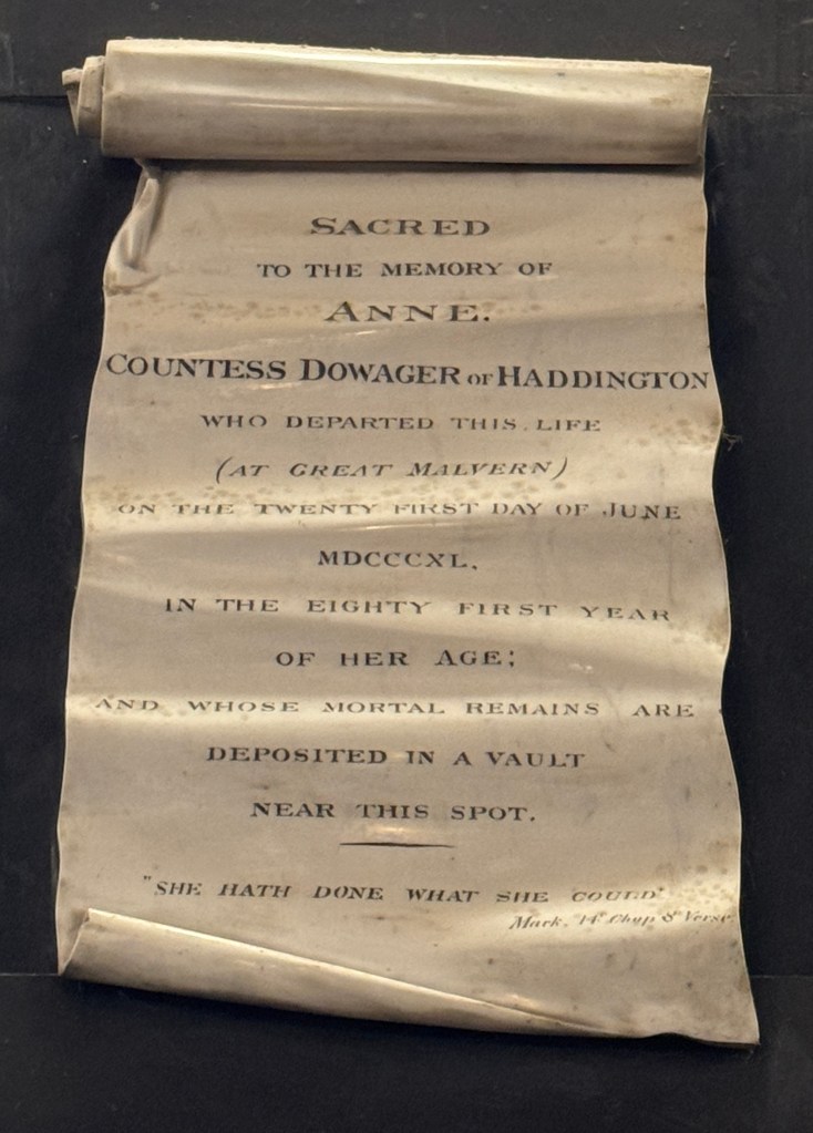 Anne died at Great Malvern on midsummer’s day 1840 and there’s a memorial to her in Great Malvern Priory (aka the Abbey). To a modern reader the bible quotation (Mark 14 verse 8) looks rather sad: ‘she hath done what she could‘ sounds as if she could perhaps have tried harder. However, Victorian readers would probably have understood it to mean that she had done everything that she possibly could.